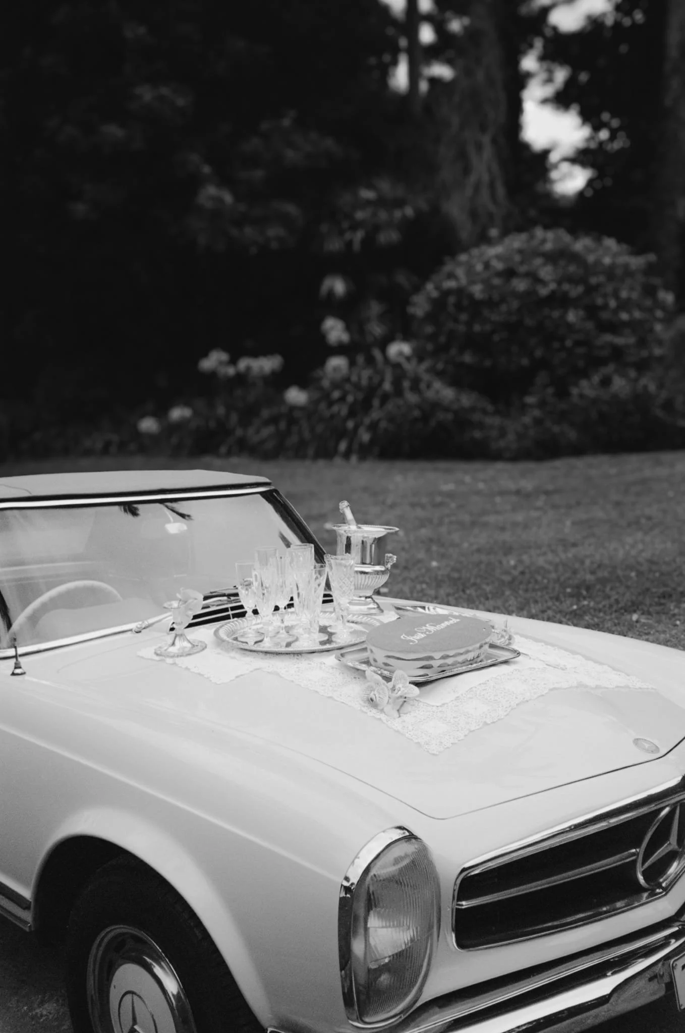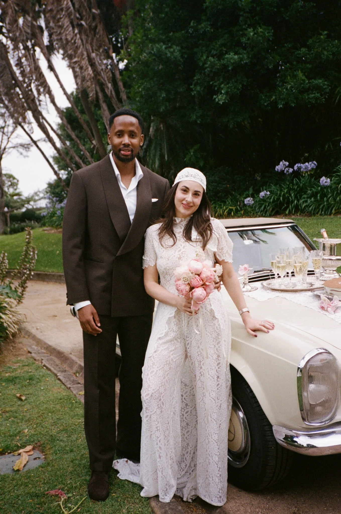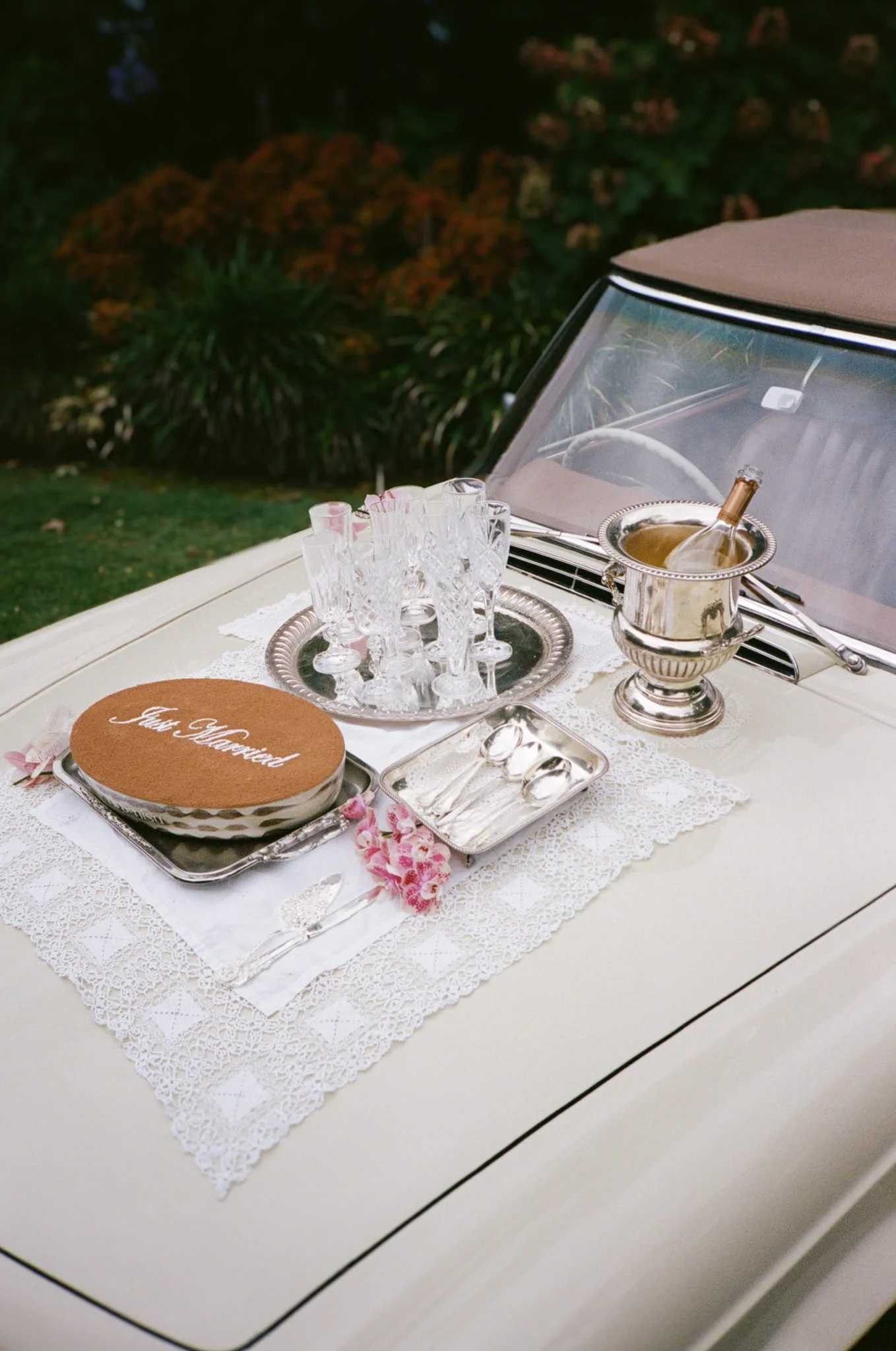 WE WERE INSPIRED BY BETTINA LOONEY’S VOW RENEWAL IN CAPE TOWN, SHE HAD BEAUTIFUL EARTHY TONED FLOWERS AND HER CEREMONY WAS CAPTURED ON FILM. WE ALSO WERE INSPIRED BY AN IMAGE WE SAW OF A CHAMPAGNE MOMENT SET UP ON THE BONNET OF A VINTAGE CAR. WE WERE SO LUCKY TO HAVE HAD RYCHELLE OF LOVE STONED STYLING BRING OUR VISION TO LIFE, IT EXCEEDED ALL EXPECTATIONS!